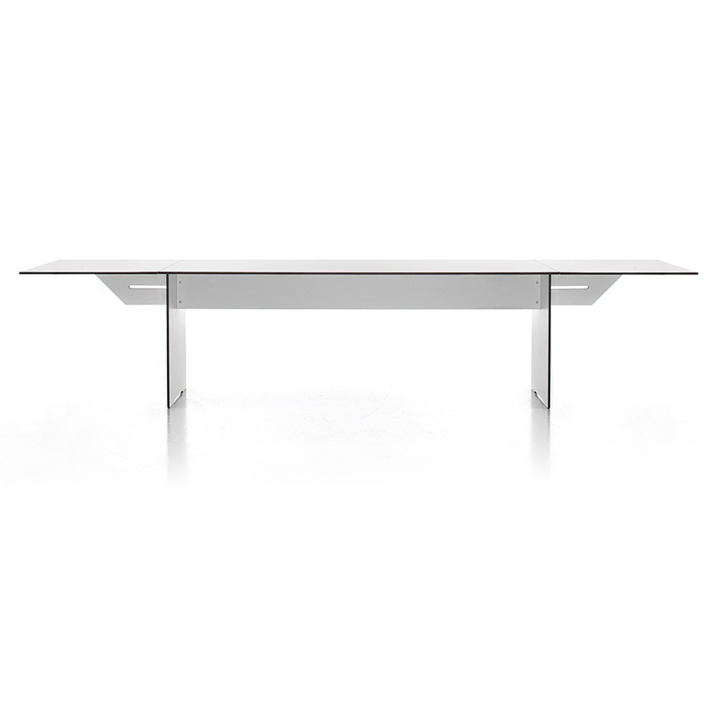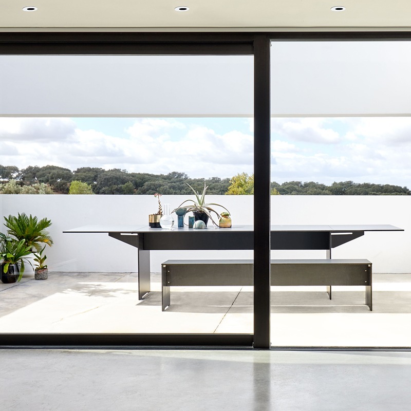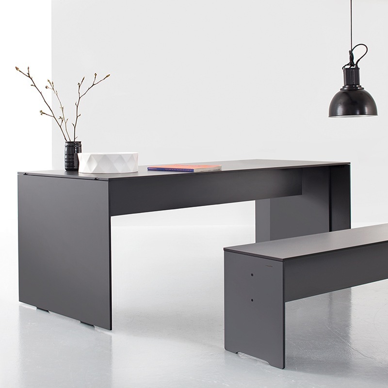 Gestell & Tischplatte aus wetterbeständigem HPL mit schwarzen Kanten