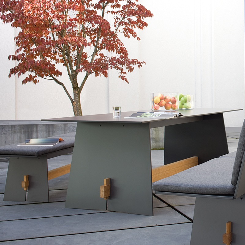 Gestell & Tischplatte aus wetterbeständigem HPL mit schwarzen Kanten